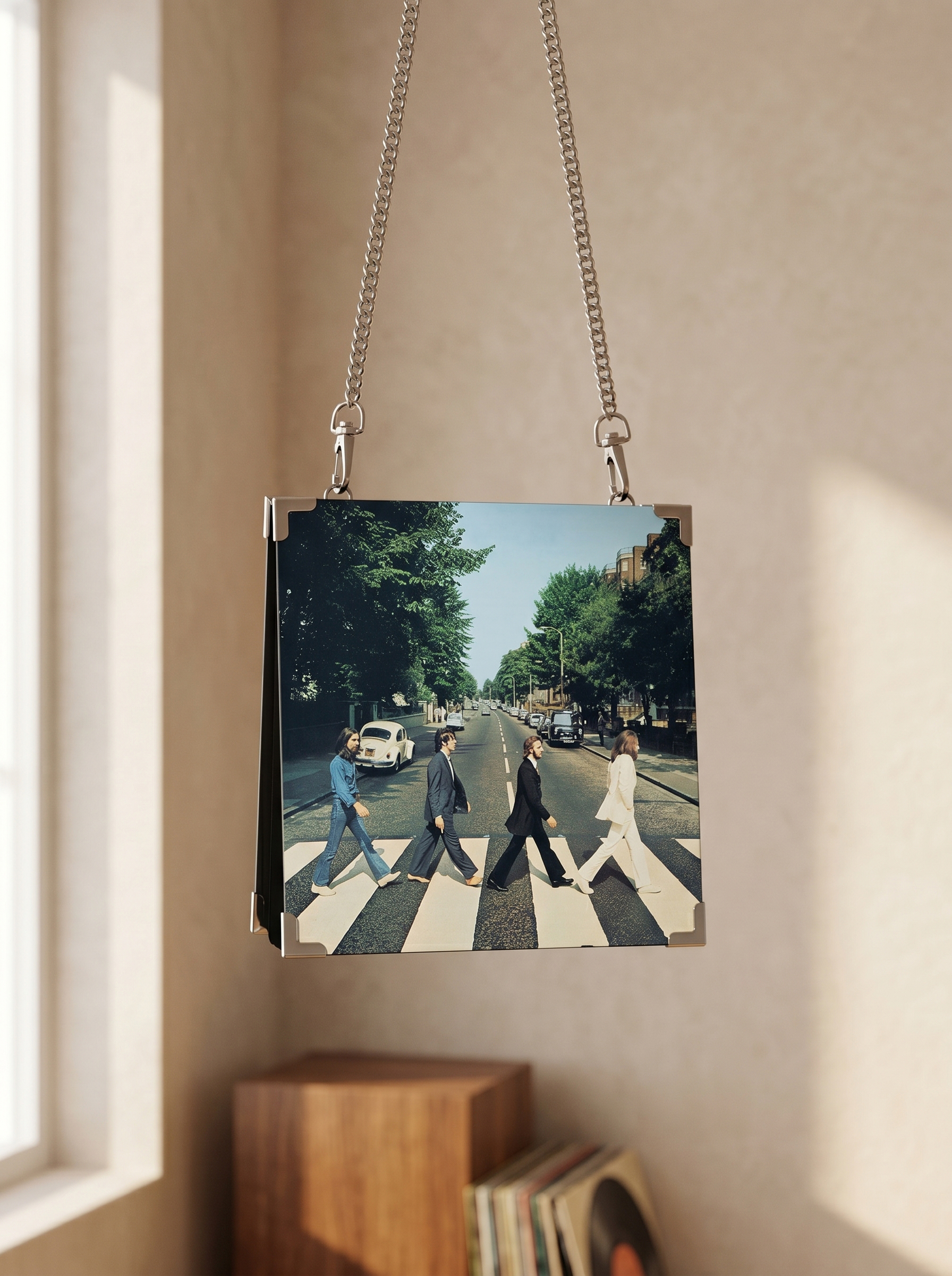 Son bolsos imitación CD o Vinilo. El encuadernado es de tela de alta calidad, resistente al agua (no sumergible) con esquineros metálicos. Incluye una cadena desmontable, para que puedas elegir como llevarla. Las tapas miden 20Cm x 20Cm. La cadena mide un metro, colgada desde el hombro llega aproximadamente hasta la cadera.