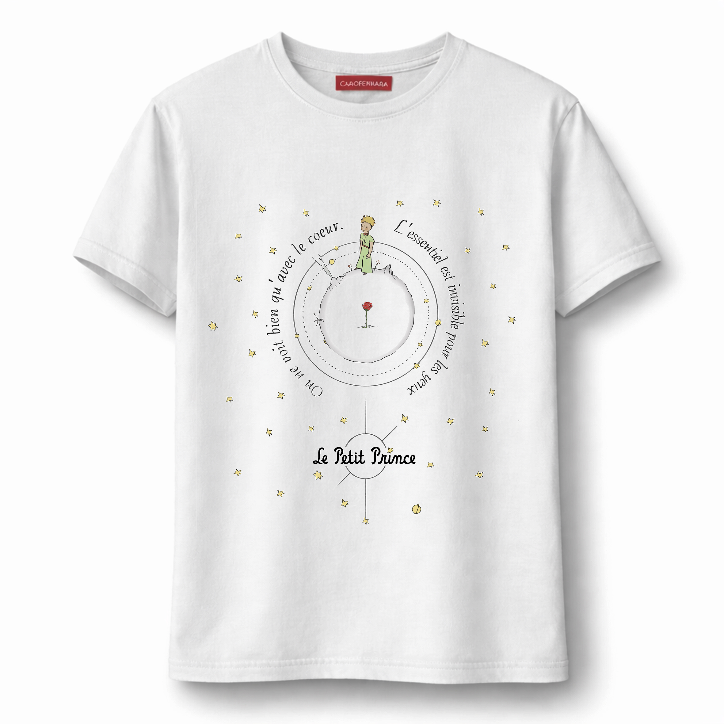 Remera de algodón color blanca estampada, con detalles bordados a mano.